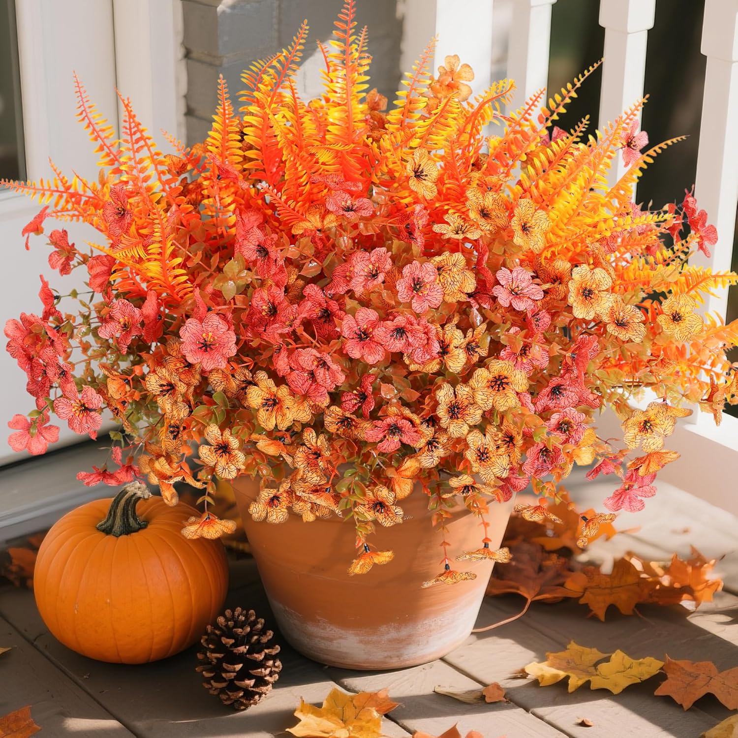 - Package include: 9 bundles of artificial daisy mums flowers (5pcs Fall-orange and 4pcs Fall-yellow), 5 bundles of orange ferns. Pot not include.