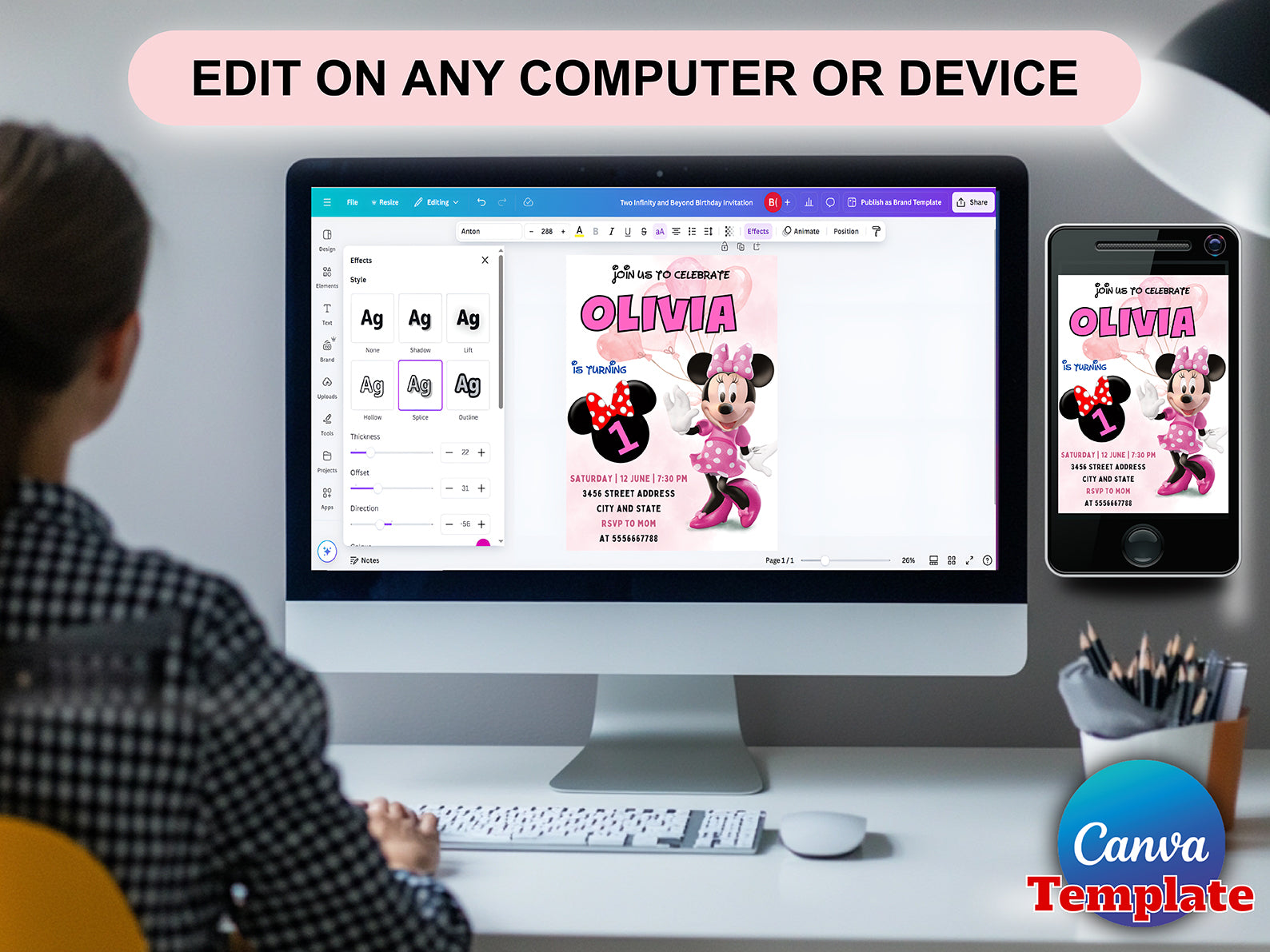 Editable Minnie Mouse Birthday Invitation(Printable)